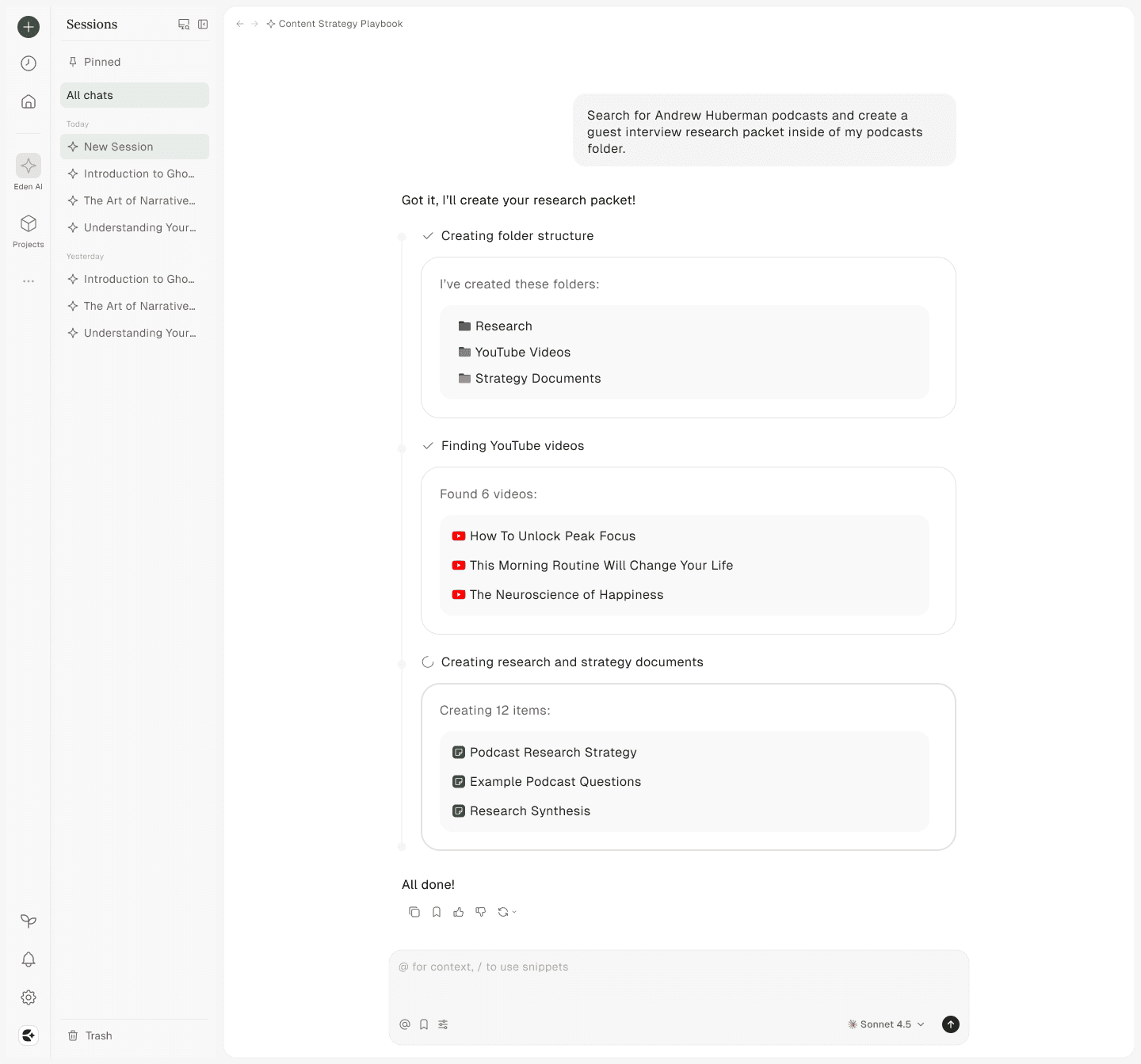 As a big example, since the agent can search the internet (and since Eden allows you to save links), I could ask for 10 podcasts that a specific person appeared on, and ask it to save it to a folder. The videos will then download and transcribe like normal.