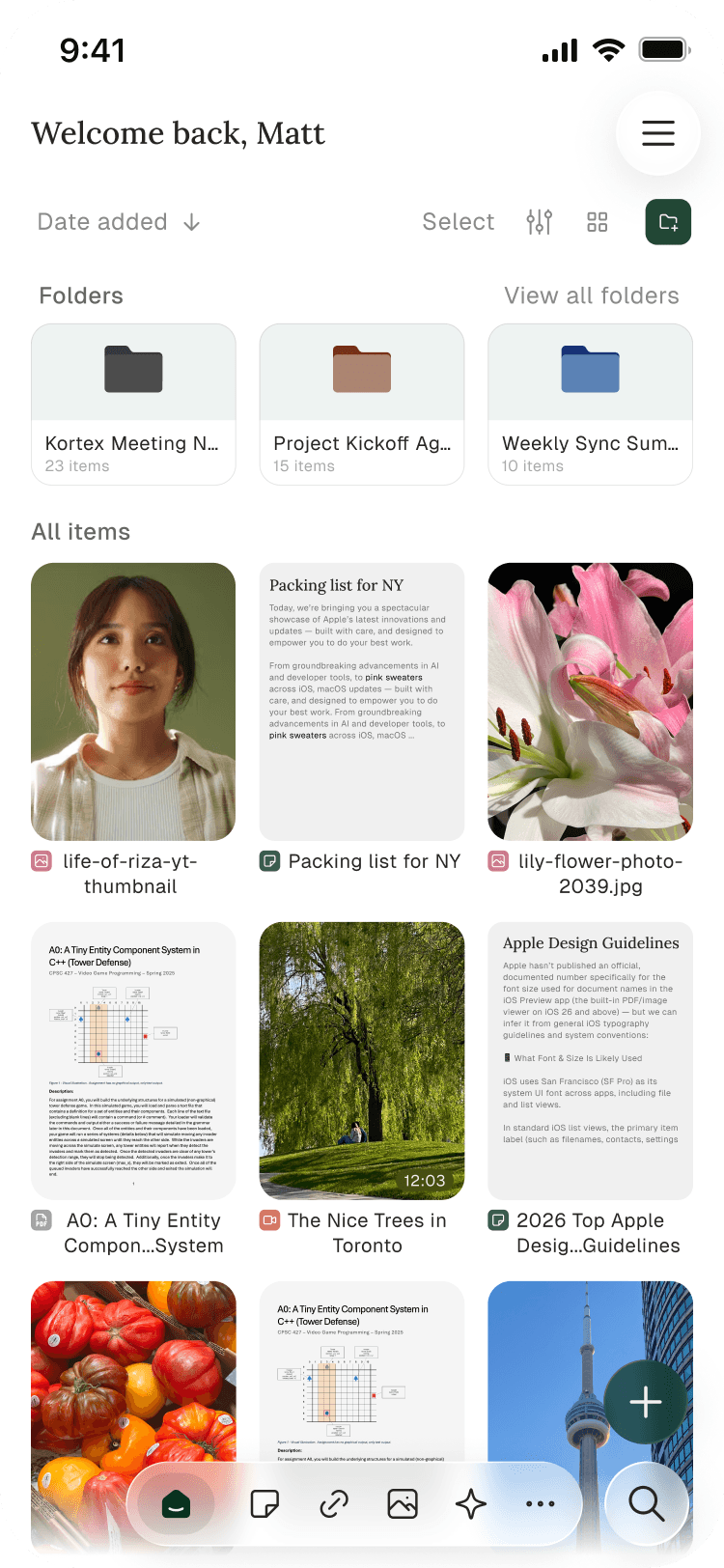 When you start a project, you can add files, folders, links, and more to the project itself. Originally, we wondered if we could just have folders be projects, but when you're working on a project, you're often pulling in research here, a video there, and a few notes from somewhere else.