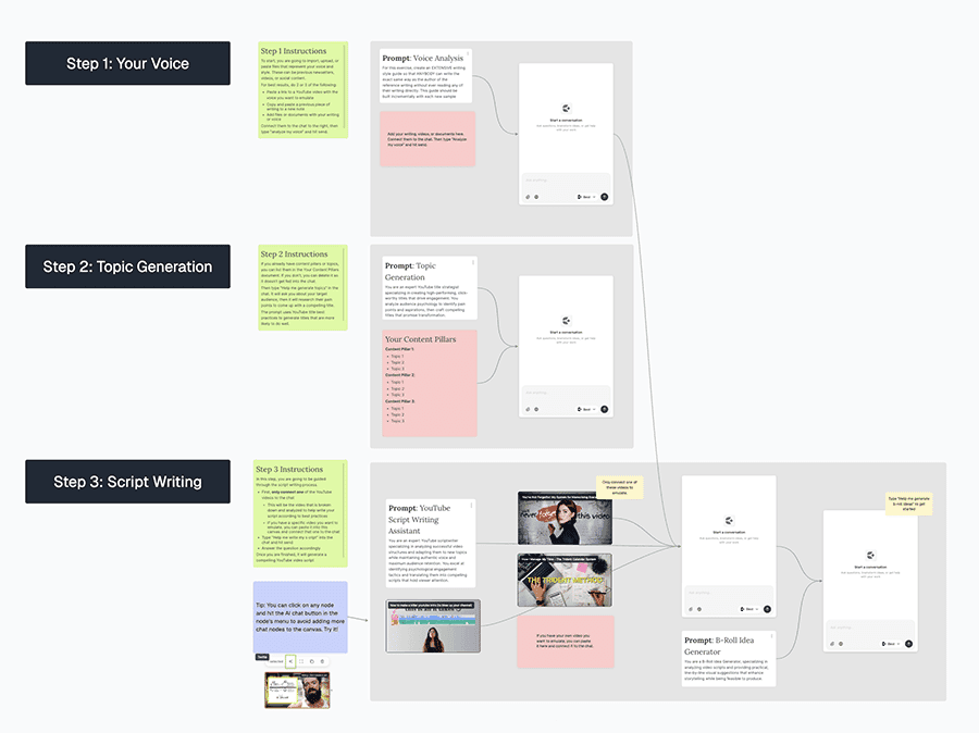 Close all your AI tools, documents, and research tabs. Add any workspace item – from notes to YouTube videos – and connect them to multiple AI chats, visually.