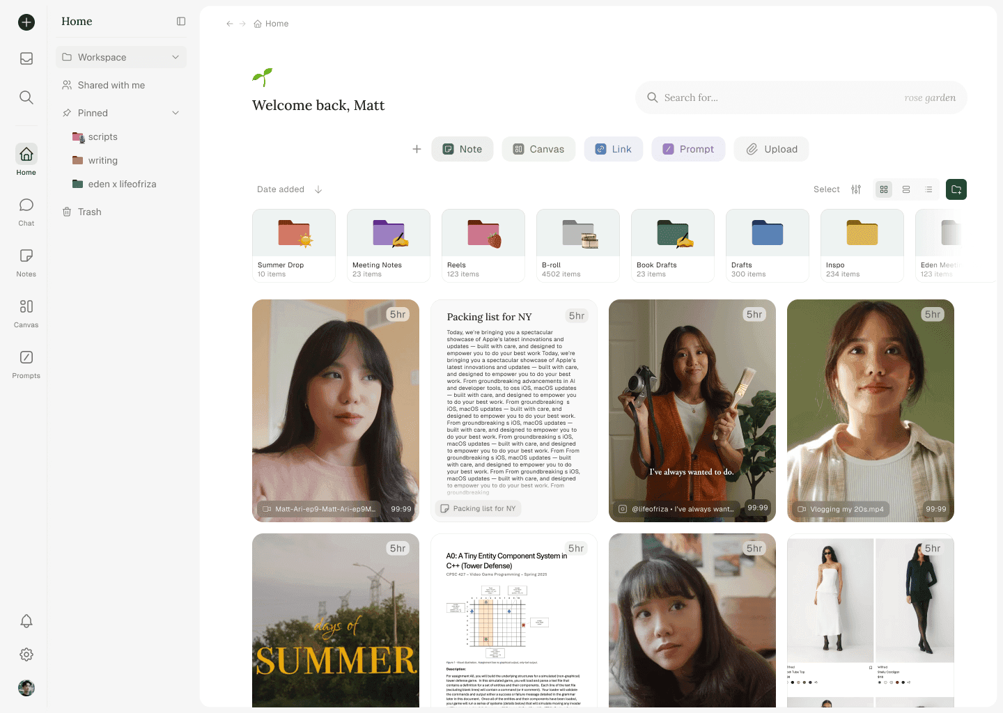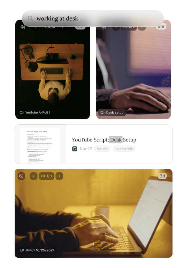 Everything you add to your workspace is automatically transcribed, tagged, downloaded, and analyzed. Reference them with AI, add them to a canvas, or search for the exact idea you need.